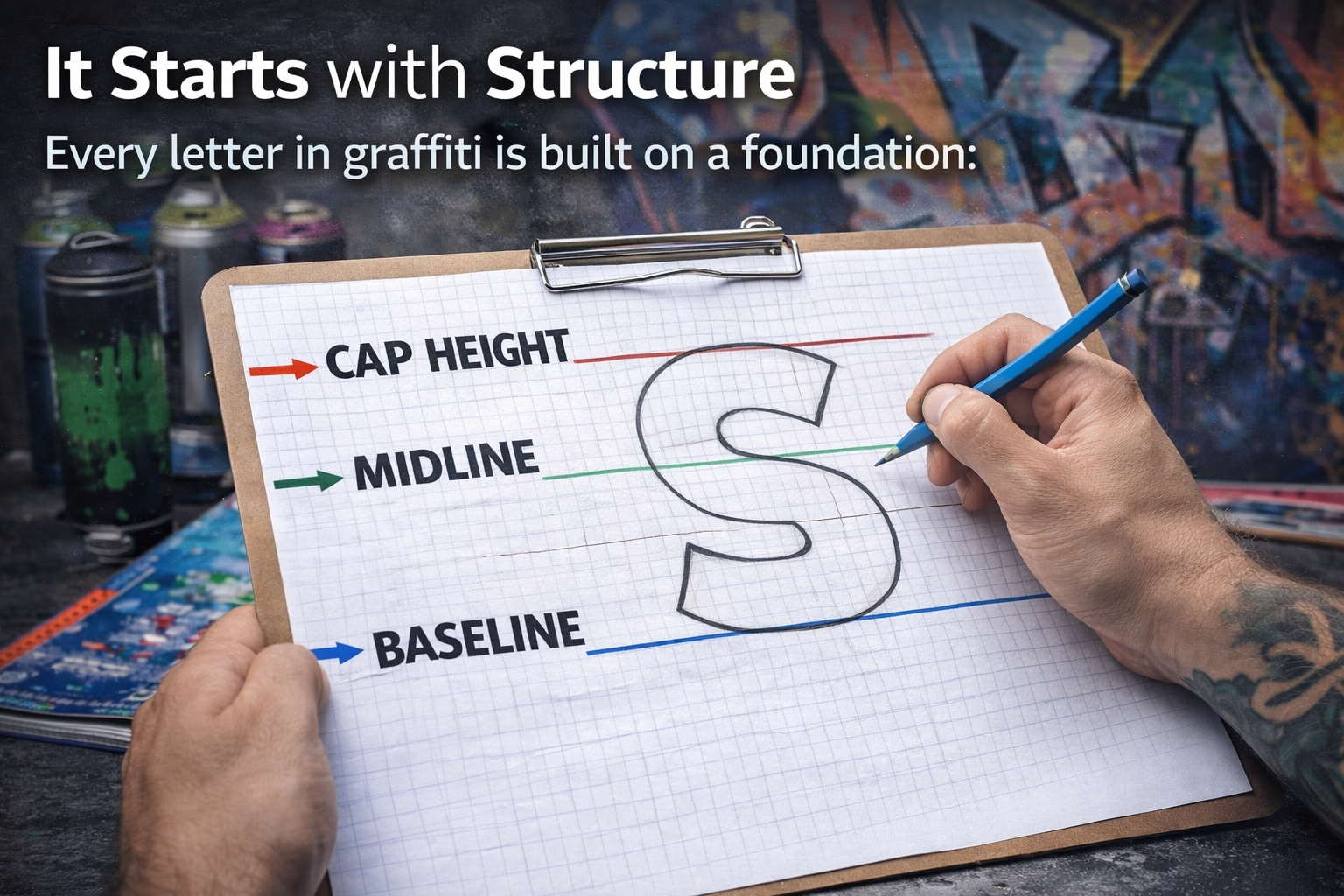 Understanding these three guides allows students to create letters that feel balanced, intentional, and powerful. Without that structure, graffiti becomes guesswork. With it, students gain control.